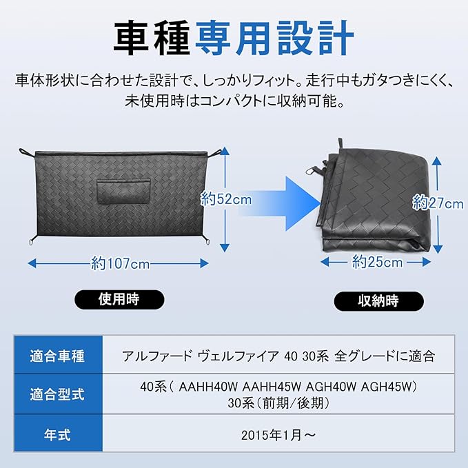 1.【適合車種】本製品は アルファード ヴェルファイア 40系 30系 全グレード対応 のトランク収納ポケットです。【対応型式】:40系(AAHH40W AAHH45W AGH40W AGH45W) 30系 (前期 後期)。【対応年式】2015年1月~ ※ラゲッジ左右に車両純正の金属フックが装備されている車両のみ対応となります。※ご購入前に、必ずお車の【年式・型式】および【金属フックの有無】をご確認ください。