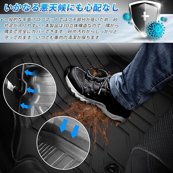 4.【3D立体構造】一般的な布製の平面フロアマットではフチ部分が低いため、砂が入りやすい。本製品は3D立体構造なので、隅から隅まで完全にカバーできます。砂や汚れからしっかりと守ってれます。いつでも車内の清潔が保ちます。