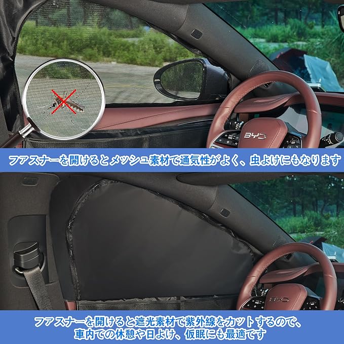 【用途が幅広い】夏の強い日差しの時に、強烈な日光を遮り、車内温度の上昇や内装の老化を最小限に抑えることができます。黒色の日除け面は日焼け防止に加え、プライバシー保護としても利用できます。また、車中泊や駐車時にも、自動車用防虫ネットが必要で、車窓を開けたままでも虫の侵入を心配する必要がありません!車内での食事、昼寝、読書などが快適になります。キャンプや野外活動などのシーンでも活躍します
