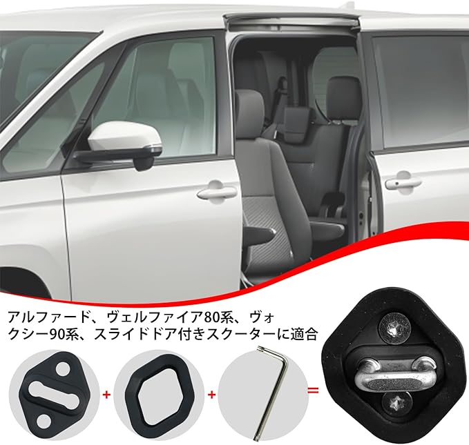 異音防止と静音性向上:高品質なゴム素材を使用したドアストライカーカバーは、スライドドアの開閉時に発生する異音や振動を効果的に防ぎ、車内の静粛性を大幅に向上させます。特にアルファード、ヴェルファイア、ノア、ヴォクシーなどのトヨタ車に最適です。