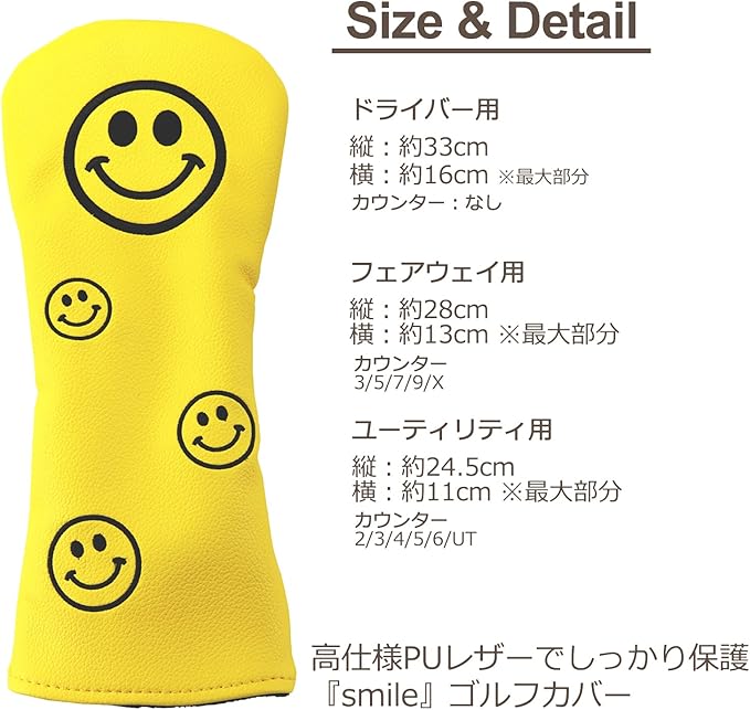 かわいいスマイルデザイン、高品質のPUレザーで、しっかりクラブヘッドを保護でき、防水タイプ、3色 ドライバー用(DR用):460cc 440cc対応 フェアウェイウッド用(FW用):3、4、5、7、X番の変換ダグ付き ユーティリティ用(UT用):2、3、4、5、6、UT番の変換ダグ付き 素材:高級PUレザー 裏生地:アクリル繊維 ※ご注意:カバー4点セットと単品 両方販売しております。ご確認いただき、間違いないように、ご購入ください。 ※カバー4点セットはDR用1点、FW用2点、UT用1点です。ご了承ください。