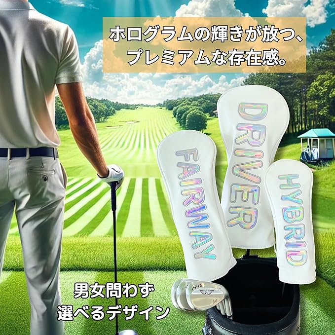 ✅プレミアムデザイン: ホログラムの輝きが美しい文字デザインで、高級感のあるホワイトカラーのヘッドカバー。ゴルフバッグをスタイリッシュに演出