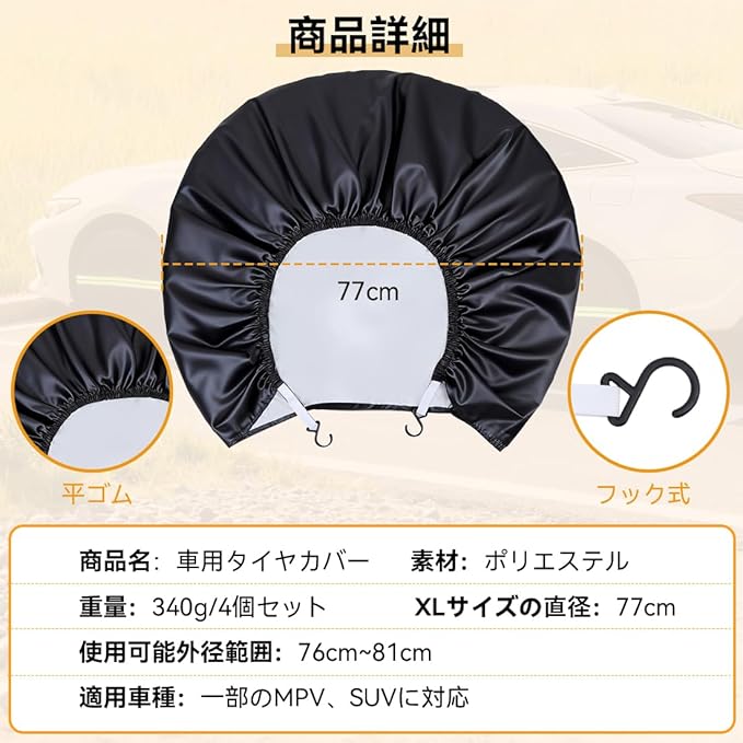 【四季対応・タイヤ全面保護】この車用タイヤカバーは、運転している車両から飛来した砂利などの衝突によるタイヤの摩耗を効果的に防ぎます。冬は雪の付着を抑え、取り外すだけで簡単に除雪ができるため、とても便利です。四季を通じて、強い日差しや雨に対応し、タイヤの劣化を遅らせ、使用寿命を延ばします。ドライバーにとっては欠かせないもの。
