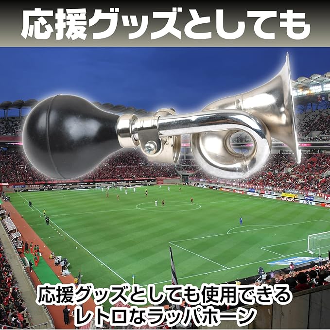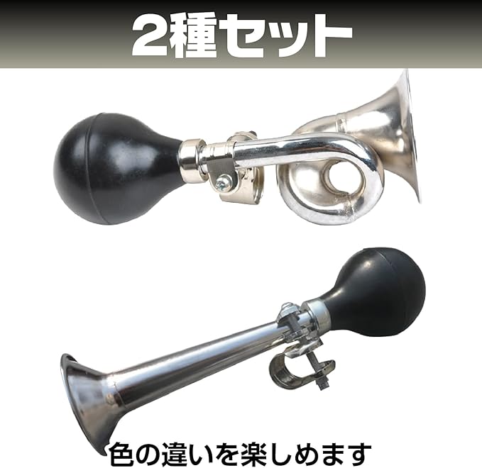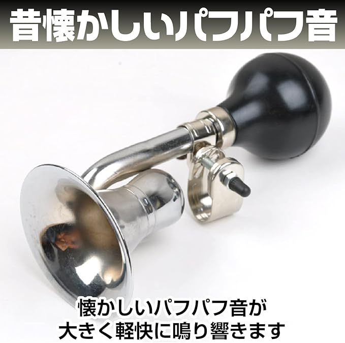 【商品内容】自転車のハンドルに取り付けられるラッパホーン(渦巻き型とストレート型)の2個セットです。 ラバー部分を押すだけで簡単に音が出るラッパは昔懐かしい「パフパフ」音色の違いを楽しめます。レトロなラッパホーン 応援グッズとしても使用できます。