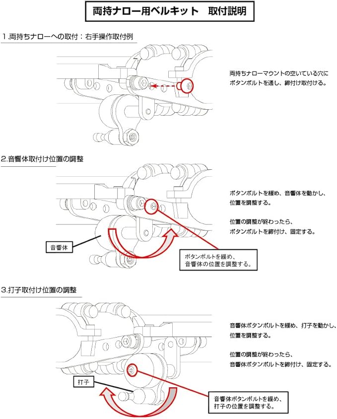 左右のアームどちらにも取付可能なのでどちらの指でも鳴らせます ※1 可動箇所が2か所あり ベル(音響体)と 打子(引き手・ハンマー) の位置も調整も可能