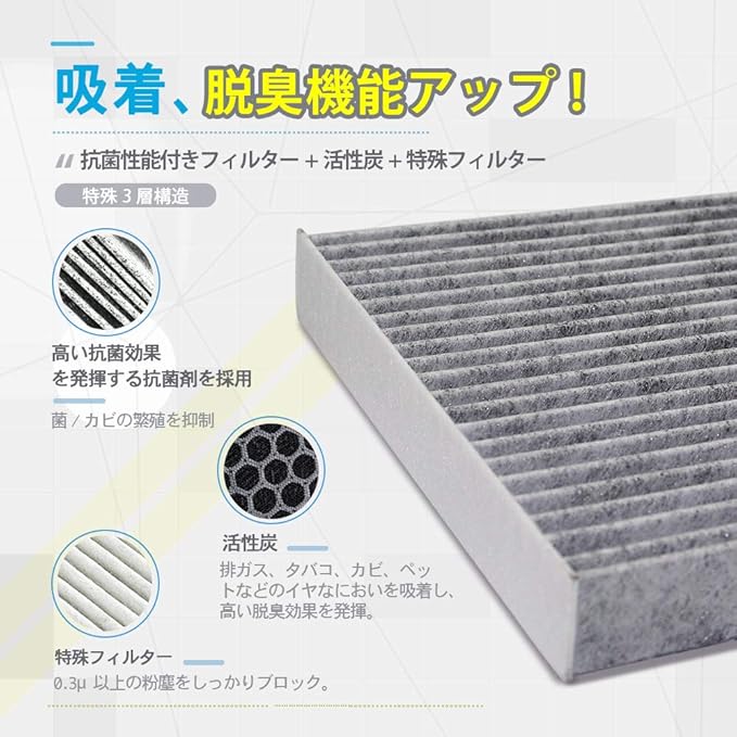 高性能活性炭を採用。排ガス、タバコ、カビ、ペットなどのイヤなにおいを吸着し、高い脱臭効果を発揮。