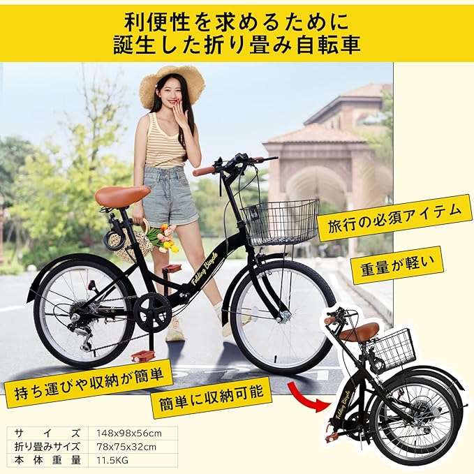 【折りたたみ自転車】: 本体サイズ(cm):約全長148x高さ98x幅56。 折りたたみサイズ(cm):約全長78x高さ75x幅32 。サドル地上高(cm):約66-84cm 。ハンドル地上高:約91-98cm 。重量:約11.5kg。適応身長:145cm以上 。耐荷重:約75kg 。自転車の必需品【カゴ、ワイヤーロック、ライト、空気入れ、ベル】が付属!日常使用に必要なものを取り揃え、あらゆるライディングニーズに応えられます。