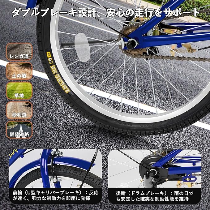 【優れた制動力】折り畳み自転車の前輪にはU型キャリパーブレーキ、後輪にはドラムブレーキを採用しており、素早い反応を実現します。強力なブレーキと耐摩耗性・滑り止め性に優れたタイヤが相まって、優れた制動力で走行中の安全を守ります。