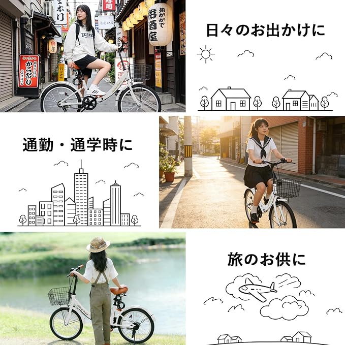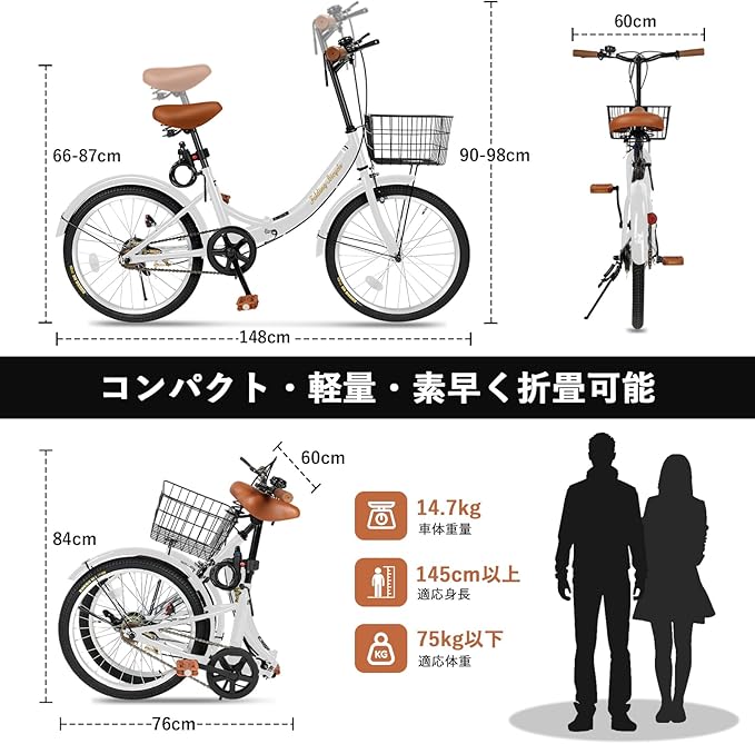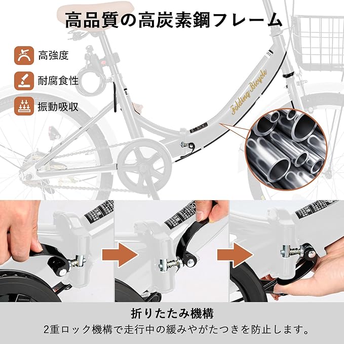 【安心のアフターサービス】折りたたみ自転車はワイヤーロック、ベル、カゴなどを同梱しております。1年保証付きで、ご連絡いただければ誠心誠意対応させていただきます。ご注意:自転車は大型商品のため、Amazonの返品受付センターで返品手続きをお受けできない場合がございます。その際は取扱説明書に記載されている連絡先までご連絡くださいませ。