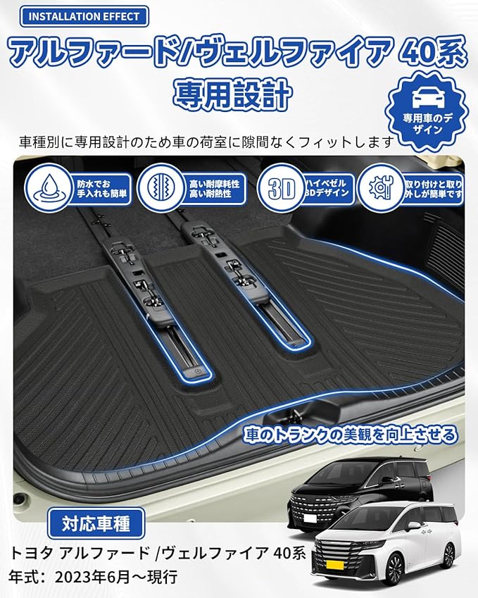 【簡単取付&メーカー保証】:alphard 40系 /vellfire 40系ラゲッジマットをラゲッジ(トランク)に置くだけです。車種専用設計のため、隙間なくぴったりにフィットします。純正品並みのフィット感を手に入れます!トランクマットを受け取ったら、車両のトランクに直接置いて、工具なしで取り付けることができます。マットを受け取ったら、車両の床に直接置いて、工具なしで取り付けることができます。時間の経過とともに回復します。お湯やドライヤーなどで暖められば、すぐに元の状態に戻ります。耐候性に優れ、長時間使用しても表面劣化が起こりません