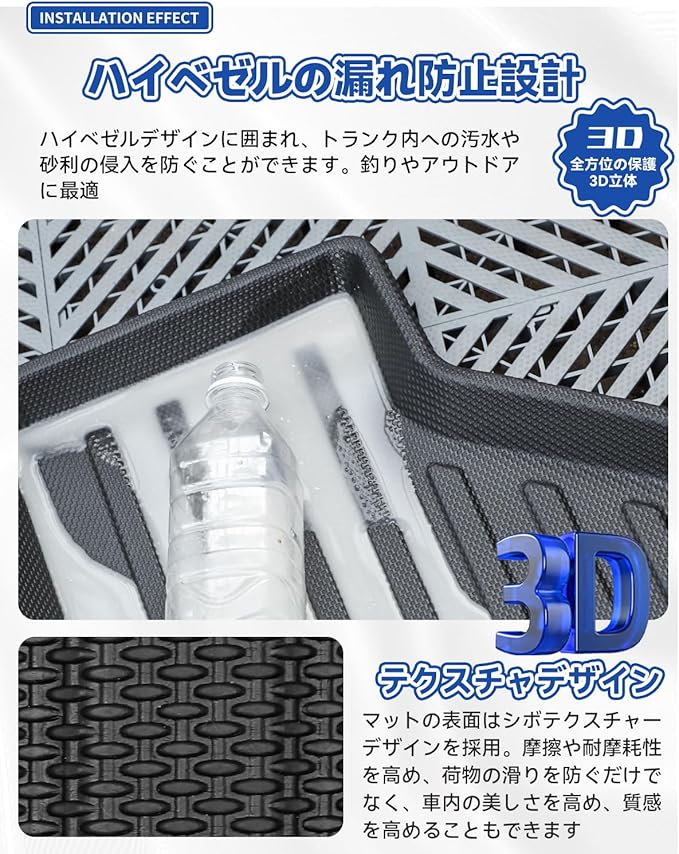 【液体の流出を防ぐ3D構造】アルファード 40 ラゲージマット/ヴェルファイア 40 ラゲージマットの縁が高い立体設計で、雨などの水や汚れが荷室に染み込むのを防ぎ、車内をより快適な環境に保ちます。隆起したサイドが保護力を高め、アウトドアやレジャーにも最適!※ トヨタ アルファード40系 トランクトレイ 注意事項※:製品が折りたたみ式で梱包するため、到着後、お湯やドライヤーなどで暖められば、商品は元な状態に戻れます。
