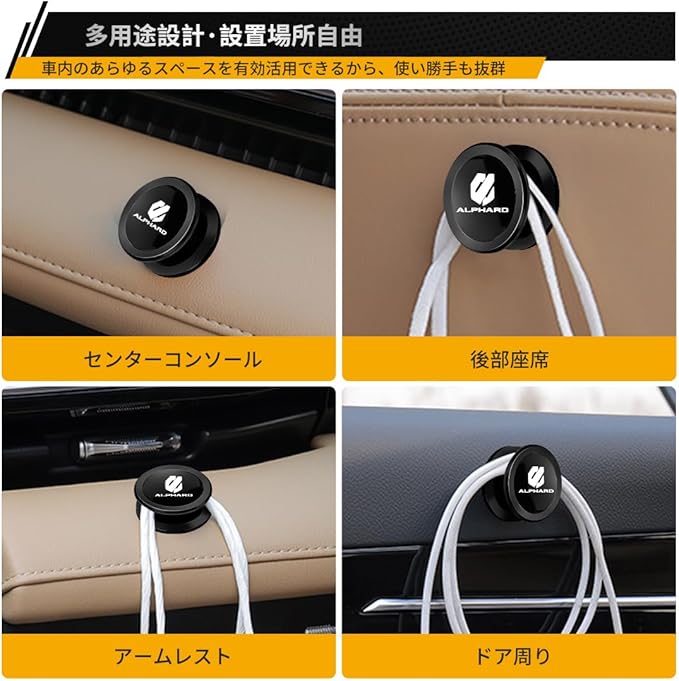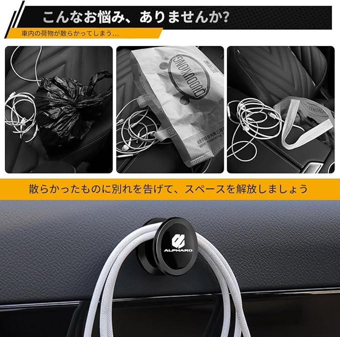 【省スペース設計と高い実用性を兼ね備えたミニサイズフック】本製品は新型アルファード 40系/30系/20系/10系 全シリーズに対応します。車内の限られたスペースをより効果的に活用できるよう設計された、見た目は小さくても、収納力は抜群で、バッグ、コンビニ袋、スマートフォンケース、イヤホン、マスクなど、日常的に使用する小物を手軽に掛けて整理整頓できます。車内の散らかりがちな物をすっきりとまとめられ、ドライブ中の快適性を向上させます。また、使用しない時でも視界の邪魔にならず、インテリアの雰囲気を損なうことなく自然に馴染むため、デザイン性と実用性を両立したアイテムです。