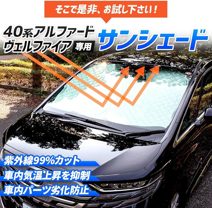 専任スタッフが何度も微調整を行い商品化した、40系アルファード/ヴェルファイア専用設計サンシェード。
