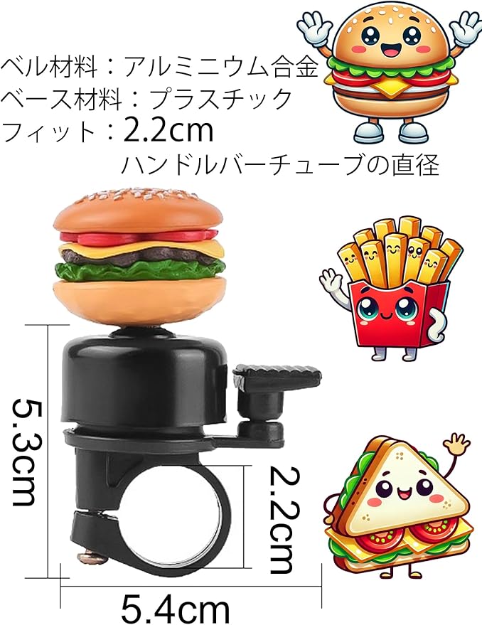 サイズ: ハンバーガー/フライドポテト/サンドイッチのかわいい食べ物自転車ベル(2.2cm/0.87インチに適合)直径 22 mm / 0.866 インチの自転車ハンドルバーに適合します。ベルを固定するためのシンプルなプラスドライバーを使用して、わずか 1 分で取り付けることができます。(* プラスドライバーは提供します!)