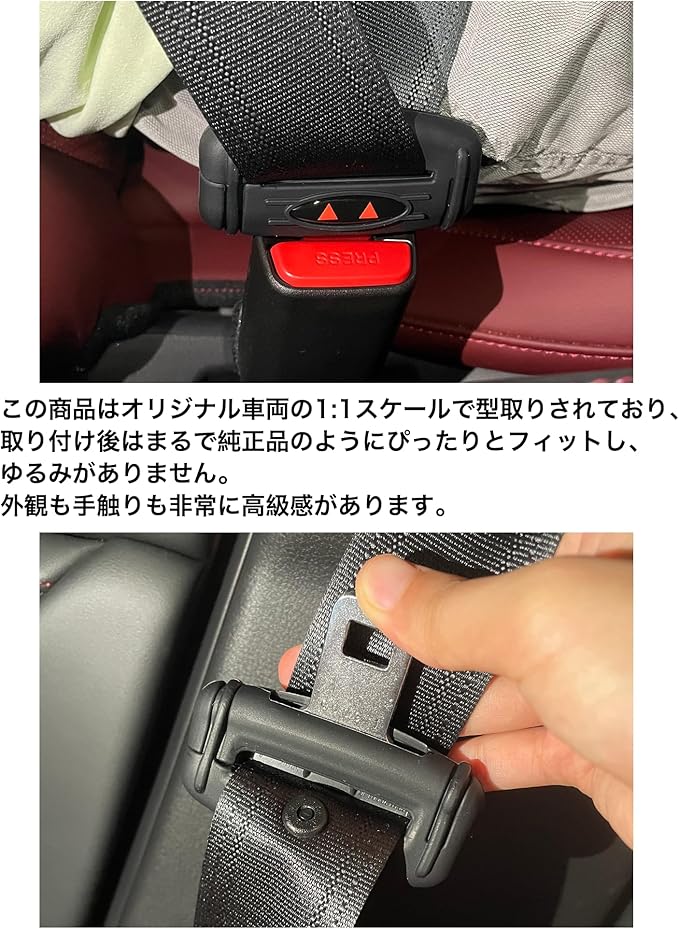 本商品は、お車の純正シートベルトバックルに1:1で合わせて型を取った専用設計です。位置を合わせて取り付けるだけで、完璧にフィットします。