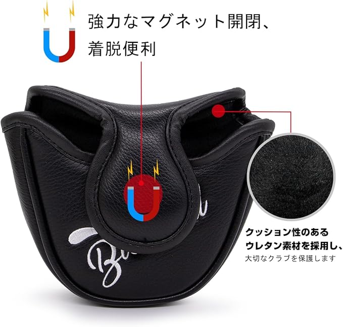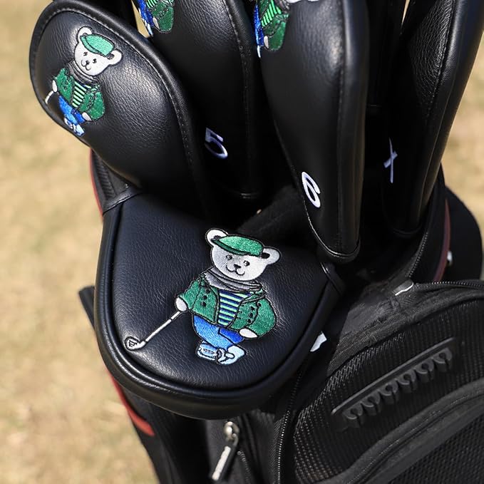 ゴルフパターカバー パターヘッドカバー ブレードパターカバー ゴルフクラブヘッドカバー ゴルフヘッドカバー PUレザー製 おしゃれ クマ刺繍 ブラック ゴルフパターヘッドカバー マグネット付き、全ブランドに適合