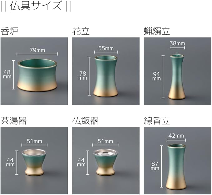 仏具セット ミニ アリア 6具足 3.0寸 グリーングラデーション 銅製仏具セット モダン仏具 真鍮 おしゃれ 仏具 香炉 花立 蝋燭立て 仏飯器 茶湯器 線香立て