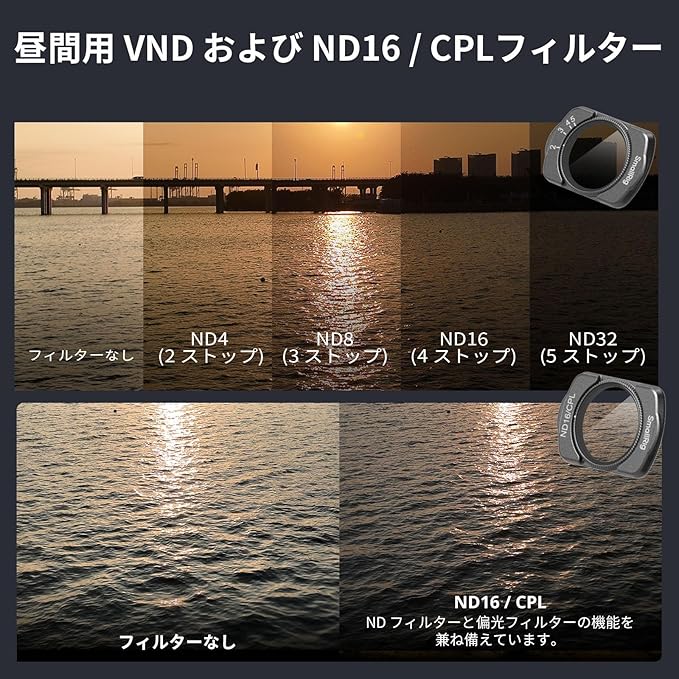 【昼間用VND&ND16/CPLフィルター】VND2-5フィルターには、ND4(2ストップ)、ND8(3ストップ)、ND16(4ストップ)、ND32(5ストップ)の5段階の調整可能なストップが含まれており、さまざまな状況で露出をコントロールできます。ND16/CPLフィルターは、NDフィルターと偏光フィルターの機能を兼ね備えており、露出をコントロールし、反射を除去し、彩度を高めます。