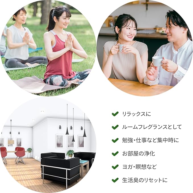 【おすすめ用途】リラックス / 空気リセット / 就寝時 / 勉強時 / 集中時 / デスクワーク / ヨガ / アロマセラピー / 生活臭防止