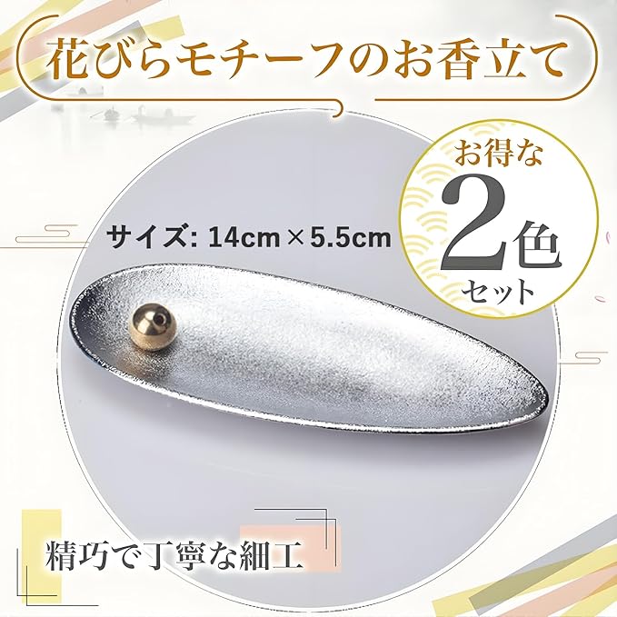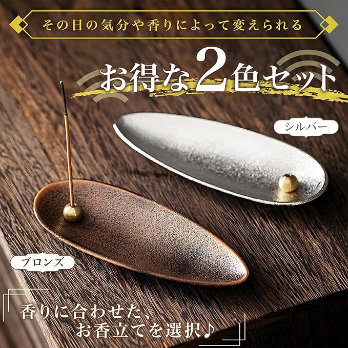 【銅+銀2色セット・高い汎用性】落ち着いた雰囲気のブロンズ色(銅)と、清らかな光沢のシルバー色の2色をセットで提供。その日の気分、使用する香りの種類(例:白檀の渋み/ラベンダーの柔らかさ)、あるいは空間のデザインに合わせて自由に使い分けることができ、1セットで複数の場面に対応できるお得な仕様です。