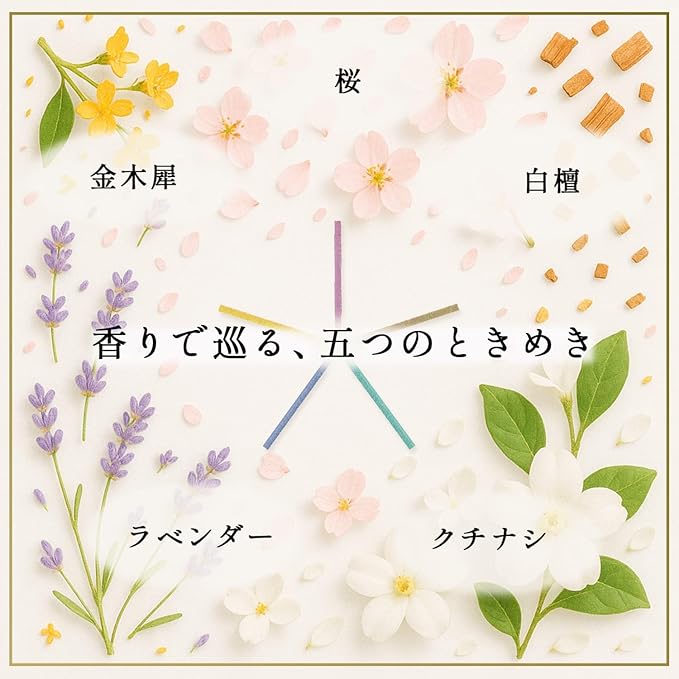 【金木犀など5種の香り】白檀・金木犀・桜・ラベンダー・クチナシの癒しの香りを詰合せたお香です。<br> 天然香料を使い、日本人の感性に寄り添う香りと品質で、香り初心者の方にも安心です。