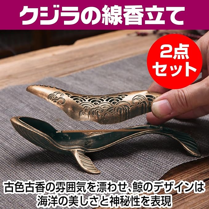お香立てセット:灰がこぼれない香炉のくじら型お香立てと、ブロンズ仕上げの合金香炉がセットになっています。おしゃれでかわいいデザインは、北欧風インテリアにもぴったりです。リビングや室内のデコレーションに最適です。