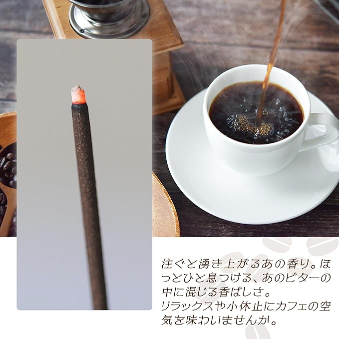 厳選されたコーヒー豆粉を使用したお香。点火してしばらくするとマイルドな暖かいコーヒーの香りが広がり、カフェの雰囲気を作り出します。