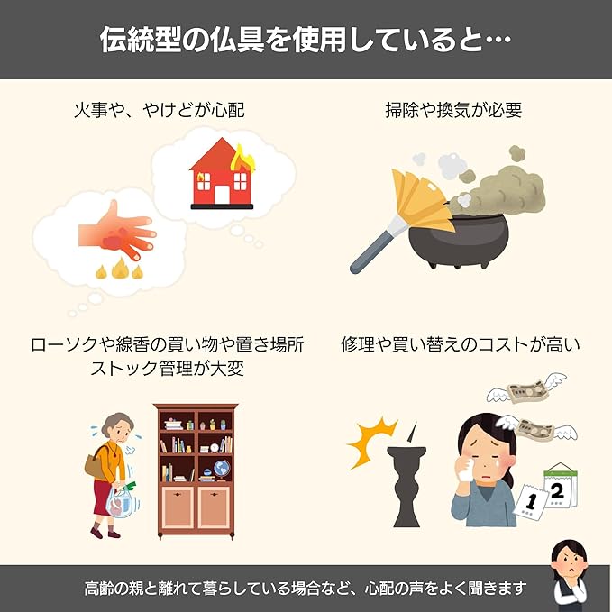 地震で倒れても火を使っていないから火災の心配もありません。煙がでないので部屋を汚さず臭いもなし香炉は、よくあるプラスチックではなく重厚感のある陶器製。