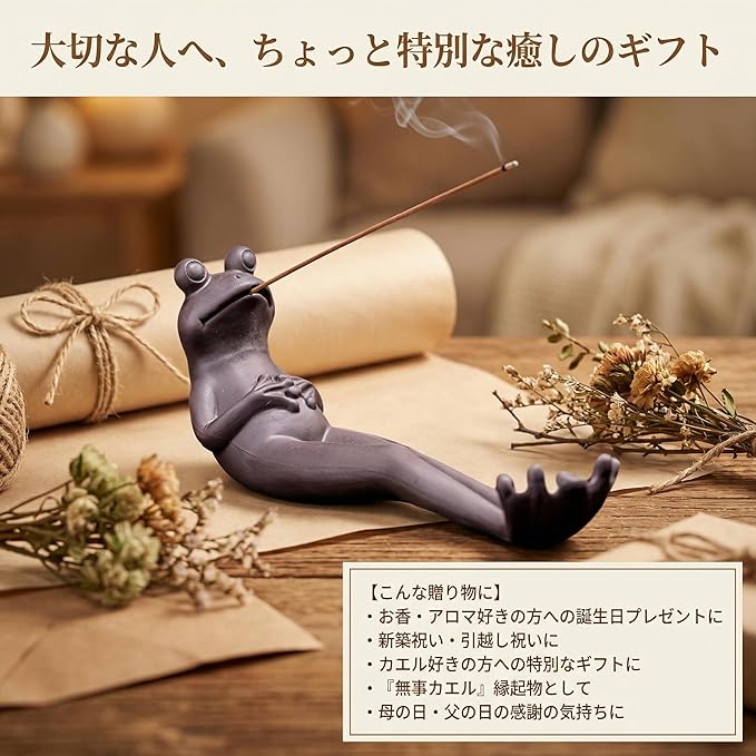 【癒しのカエル香立て】 口元にお香をくわえたユーモラスな表情が魅力の「カエル お香立て・線香立て」。スティックタイプのお香・線香を差し込むだけで、ゆらゆら立ち上る煙を眺めながら心からリラックスできる癒しの時間をお楽しみいただけます。インセンスホルダーとしても抜群の存在感です。