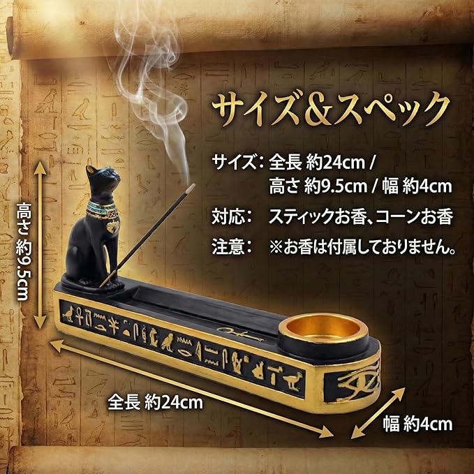 【古代エジプトの猫神バステトが見守る神秘的なお香立て】凛とした黒猫の表情とゴールドのヒエログリフが織りなす、高級感あふれるエキゾチックなデザイン。置くだけでお部屋が異国情緒あふれる特別な空間に変わります。