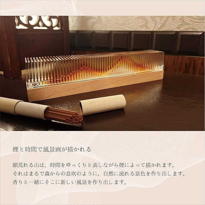 透明なアクリルケースとメープルウッドが織りなす、『過ごした時間を形にする』新しい香器。 使えば使うほど、連なるアクリル板が燻されて隠れた山が姿を見せる。香りも見た目も楽しめる、美麗で大人なデザインのお香立てです。