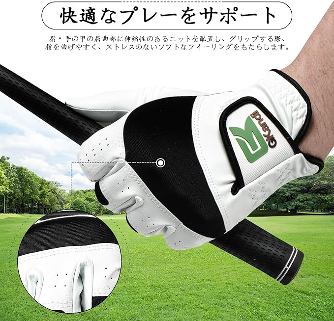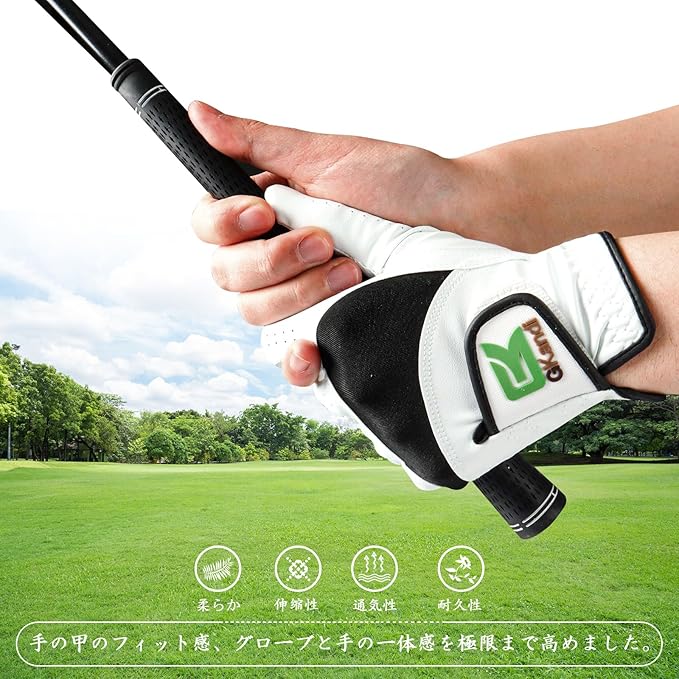 P4.優れたフィット感:柔らかく伸縮性に優れたミクロファイバーレザーとニット素材の採用で、グリップ時の手にフィット。素材の組み合わせにより、適切な摩擦力が得られ、スイング中に手がしっかりとクラブに固定されます。滑りをなくし、より正確なショットを実現しましょう。