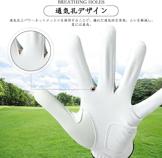 P2.強力グリップ:しっとりとした ミクロファイバーレザーと羊革で、強力なグリップ力を発揮。伸縮性のある素材により、幅広い動きが可能で、長時間のラウンド中の疲れを軽減します。
