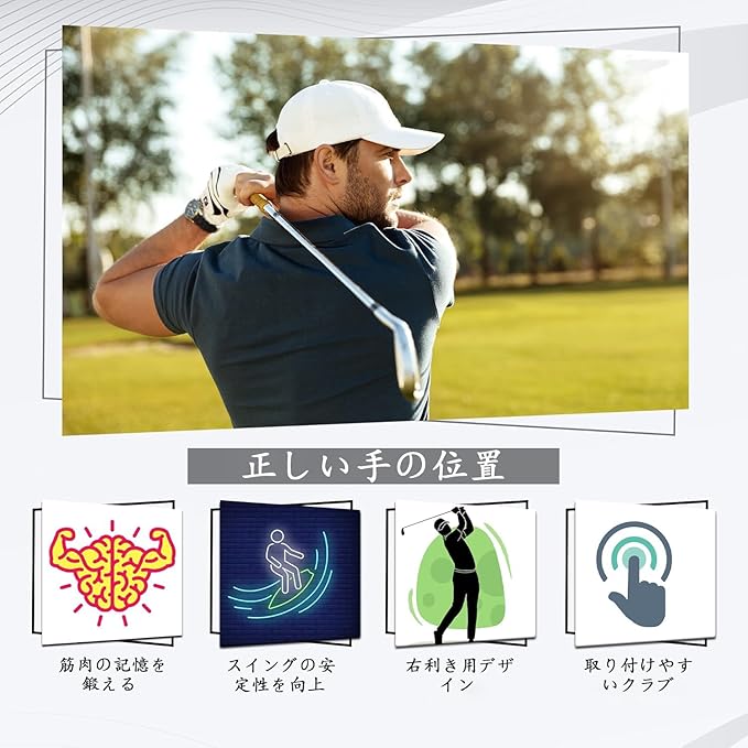 正しいグリップ姿勢を習得:ゴルフスイングの基礎となる正しい手の位置と握り方を自然にガイド。安定したスイング作りをサポートします。