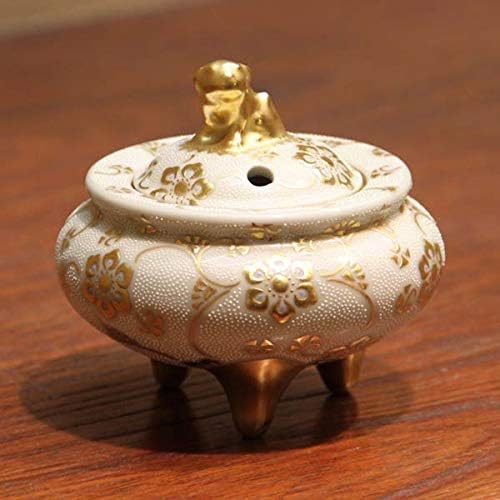 仲田錦玉 九谷焼 獅子ツマミ香炉 渦打白粒盛金宝相華唐草