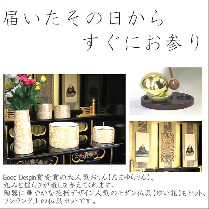 【こだわりの仏具をそろえた一式セット】お仏壇を買うときに困るのが仏具。何が必要かわからない、大きさが合うかどうか不安、、、、さまざまな疑問や不安を感じることも多いはず。そこで、お飾りに必要な仏具を全てセットしてお届け。届いたその日からお参りいただくことができます。知識豊富な専門家がお仏壇にピッタリの仏具をコーディネートしているので初めての方でも安心です。仏具は可憐でモダンな仏具「ゆい花」をセット。陶器に華やかな花柄デザイン、シャンパンゴールドのカラーリングでお仏壇の雰囲気がガラリと変わります。おりんはGood Design賞受賞のモダンりん「たまゆらりん」。コロンと丸い可愛いフォルム、たたくとゆらゆらと揺れながら美しい音を奏でる姿に癒されること間違い無しの大人気おりんです。