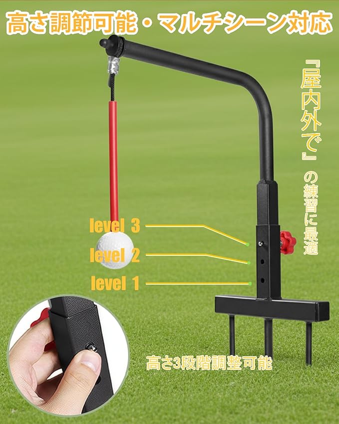 スイングリズムを安定させる練習器具 室内・ベランダ・庭などスペースの限られた場所でも本格的なスイング練習が可能。繰り返しの練習で筋肉の記憶を養い、自然なテンポで安定したショットを身につけられます。時間がない日でも短時間で効果的に練習できます。