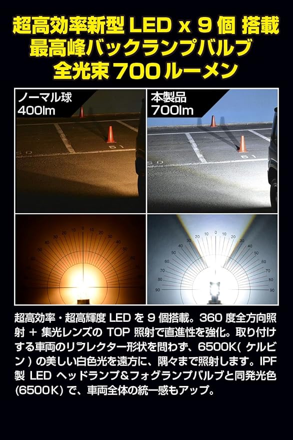 M's Basic by IPF バックランプ LED 車用 T20 700lm 6500K ホワイト 12V用 1本入 車検対応 ノイズ対策済 ハイスペックモデル ハーフミラートップレンズ ステルス性向上 AMZ-BL501
