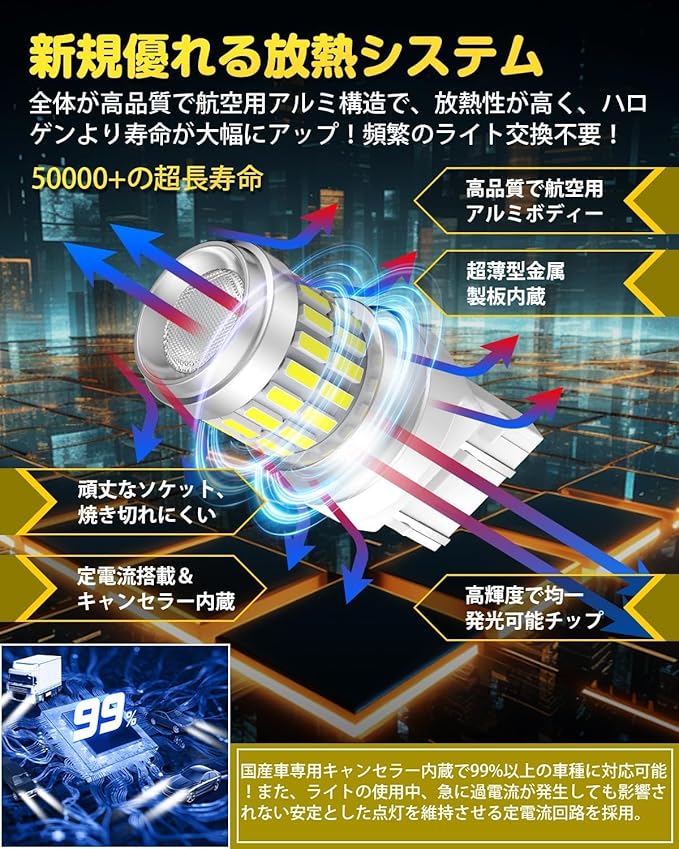 【キャンセラー内蔵&簡単取付 – 車両適合率アップ!】Perrace T20 LED ダブルは、日本国産車向けに設計された専用キャンセラー内蔵モデル。ハイフラや警告灯の点灯を抑え、安心の互換性を実現。また、無極性&純正球と同サイズのミニ設計だから、ソケットに差し込むだけで簡単装着!工具不要で、初心者の方でもスムーズに交換可能。