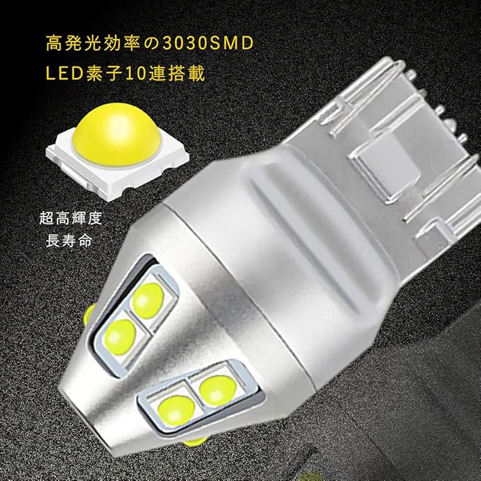 【仕様】 規格:T20 LED ダブル W21W T20 7440 7443 / 消費電力:4.8W / 電圧:DC12V-30V / 発光色:ホワイト / 色温度:6000K / チップ採用:拡散型3030SMD / チップ数:10連 / サイズ(約):全長33mm 最大直径18mm 差込口幅15mm