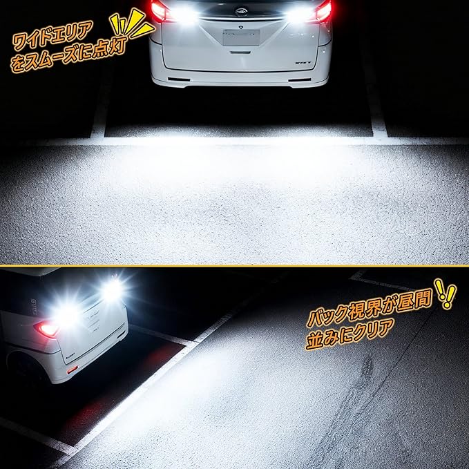 『T16/T15 バックランプ』高輝度3030 LEDチップを搭載し、最大1400LMの明るさを実現。360度全方向発光設計により、ムラのない均一で柔らかな光を車両後方へ広く照射。夜間や暗所でもバックカメラで後方を鮮明に確認可能で、後退時の視認性向上をサポートします。※DC12V車専用。