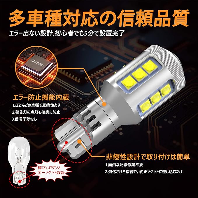 『CANBUSキャンセラー内蔵』球切れ警告灯やエラーメッセージを抑制するCANBUS対応設計。国産車から輸入車まで幅広い車種に対応し、ハイブリッド車・EV車・PHV車にも使用可能です。対応ソケット:T16 / T15 / 912 / 921 など。