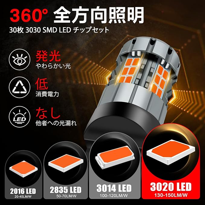 【超明るい&360度照明】当社のT20 LED電球は、従来の電球と比べて驚きの400%の明るさを実現しています。各7440 LEDブレーキライトには、30個の3030SMD超高輝度チップが搭載されており、1800Kの鮮明な色温度で優れた照明を提供します。都市部での運転や暗い田舎道での走行時でも、最大視認性を確保することで、あなたと他者の安全が大幅に向上します。車両のバックミラー設計に準拠し、暗部がなく、後方映像で車の後方を明確に確認できます。