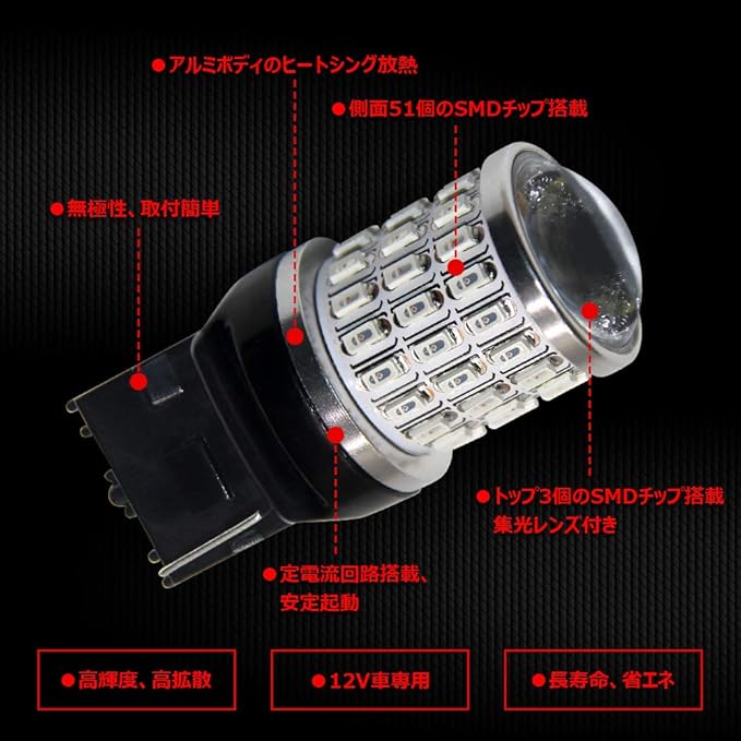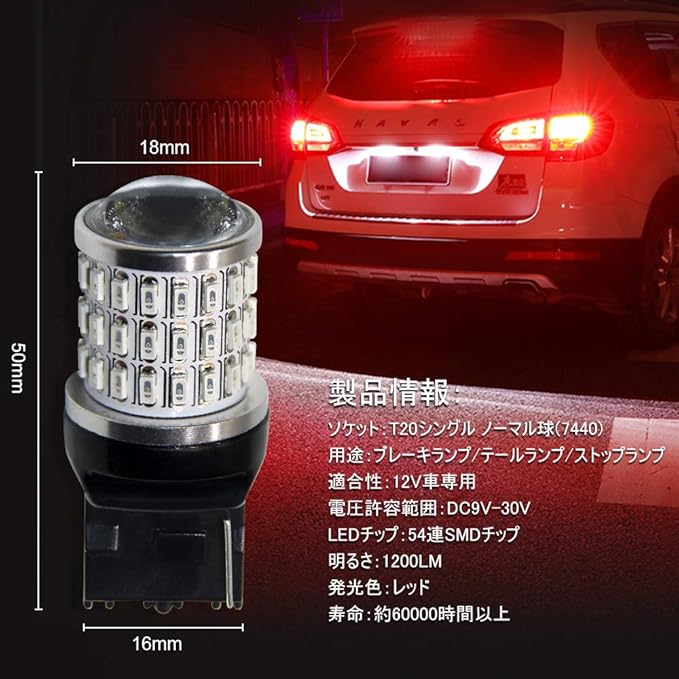 高輝度、高拡散:T20 LED テールランプ は1個で54連のSMDチップを搭載して、高輝度で後続車へのアピールで追突防止に効果を発揮して、安 全走行をサポートします。