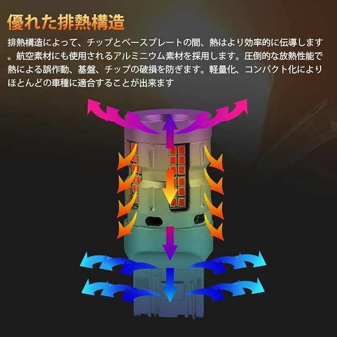 【放熱対策・定電流回路搭載】熱伝導性に優れるアルミ基板を採用し効率よく放熱を促進し、光量低下率を抑えます。定電流回路を搭載し突発的な車両電圧変化に影響されずに安定した点灯を確保します。ハイブリッド車両にも使用可能。