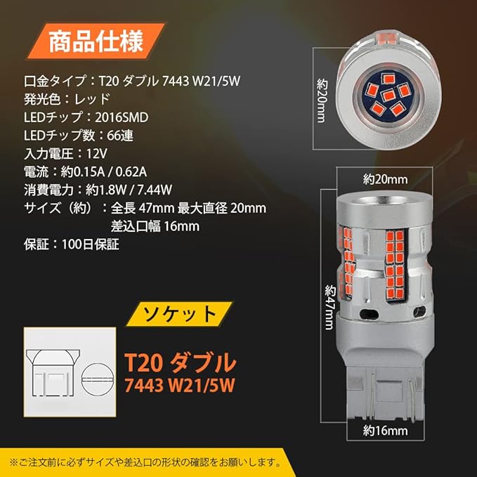 【商品仕様】規格:T20 ダブル 7443 W21/5W / 消費電力:約1.8W/7.44W / 素子数:66個 / LED仕様:2016SMD LED / LEDカラー:レッド / 保護回路:定電流回路搭載 / 仕様電圧:DC12V車[HV車・EV車対応] / 用途:テール&ストップランプ / 入数:2個 / サイズ 全長:47mm 最大直径:20mm 幅:約15mm
