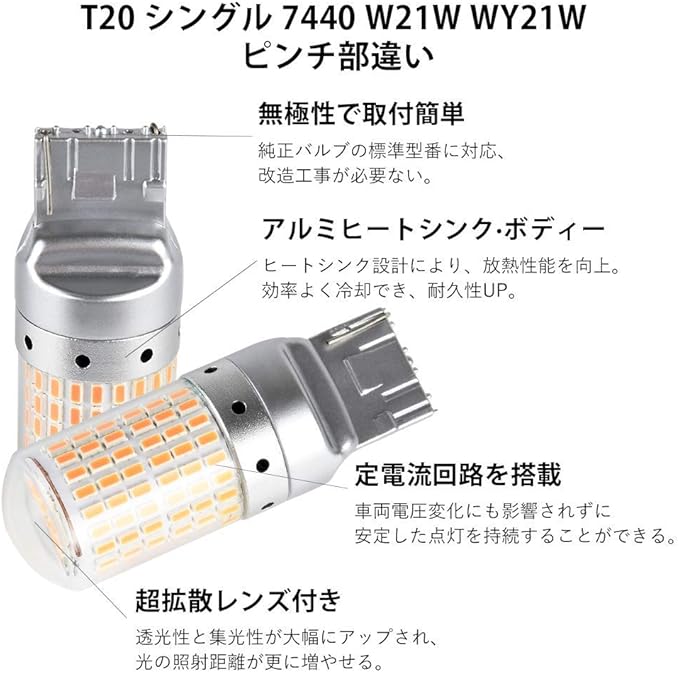 【商品仕様】口金タイプ:T20 シングル 7440 W21W WY21W ピンチ部違い / 発光色:アンバー / LEDチップ:3014SMD / LEDチップ数:144連 / 入力電圧:DC12V / 電流:1.75A / 消費電力:21W / 極性:無極性 / サイズ(約):全長57mm 最大直径20mm 差込口幅16mm / 保証:100日保証。(※ご購入前に、必ずバルブのサイズや差込口の形状、タイプの確認をお願いします。)