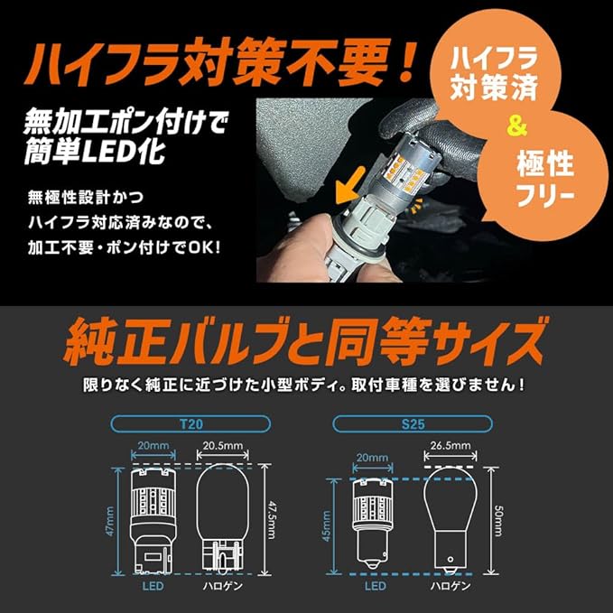 【無極性&簡単取付】無極性なので、純正級の交換と同じく挿し込むだけのポン付け交換となります。後付けキャンセラーも不要なので、加工要らずで取付が可能となり、取付工数を大幅に減少し作業時間もグッと短縮させます。更に純正球同等サイズなので、車種を選ばず装着が可能です。