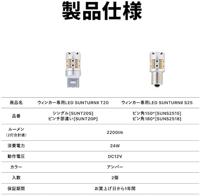【製品仕様】商品名:SUNTURN2(サンターン2)、形状:T20 シングル、入数:2本、ルーメン:2200lm、カラー:アンバー、対応電圧:12V、消費電力:24W、保証期間:お買い上げ日より1年間