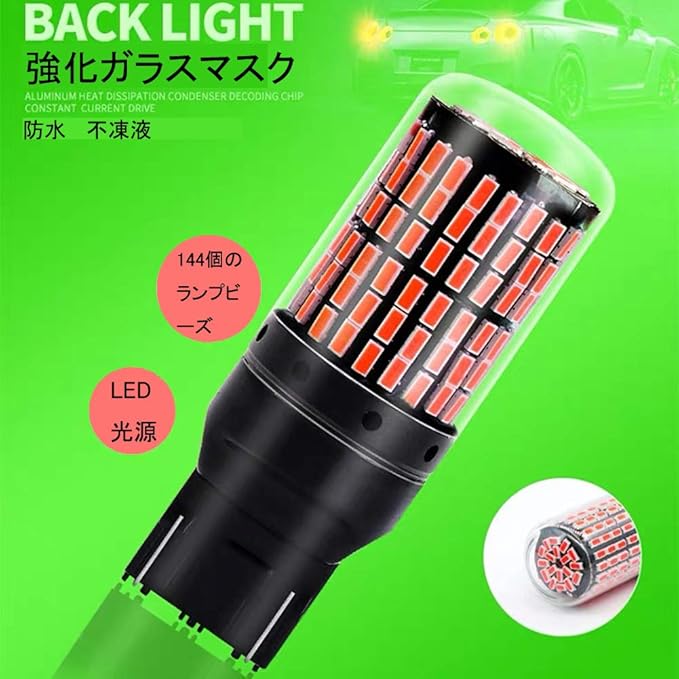 【高輝度&拡散照射仕様】高輝度赤色照射の3014SMD LED素子144連搭載。超拡散レンズ(全カバー)付きで照射距離を伸ばすことに成功しました。全方位照射仕様。昼間の環境で十分確認出来る明るさと拡散性、純正ハロゲン球より明るいのに省エネ、明るさは約3倍に大幅アップしました。